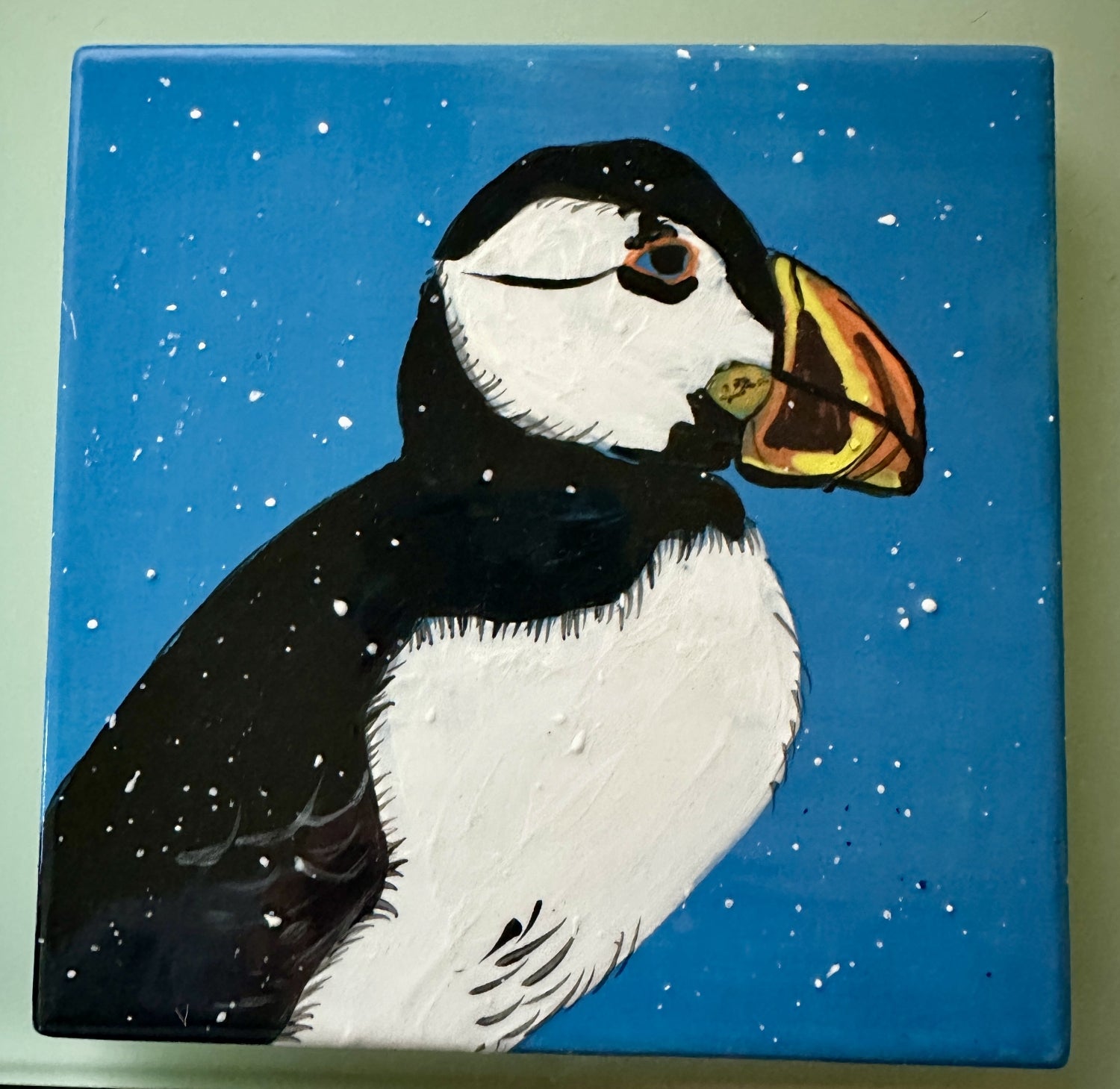 This piece is made with earthenware, underglaze and gloss glaze ceramic tile.