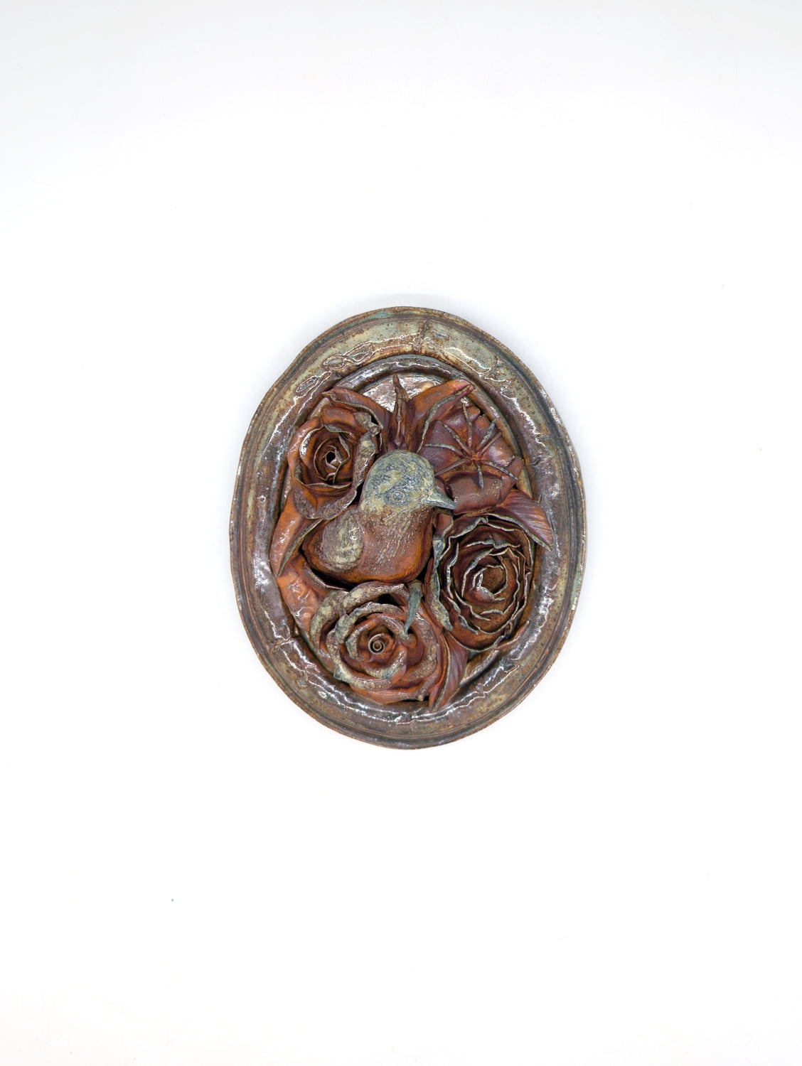 This piece is a handbuilt sculpture made with stoneware, underglaze, glaze, and soda fired to cone 10.