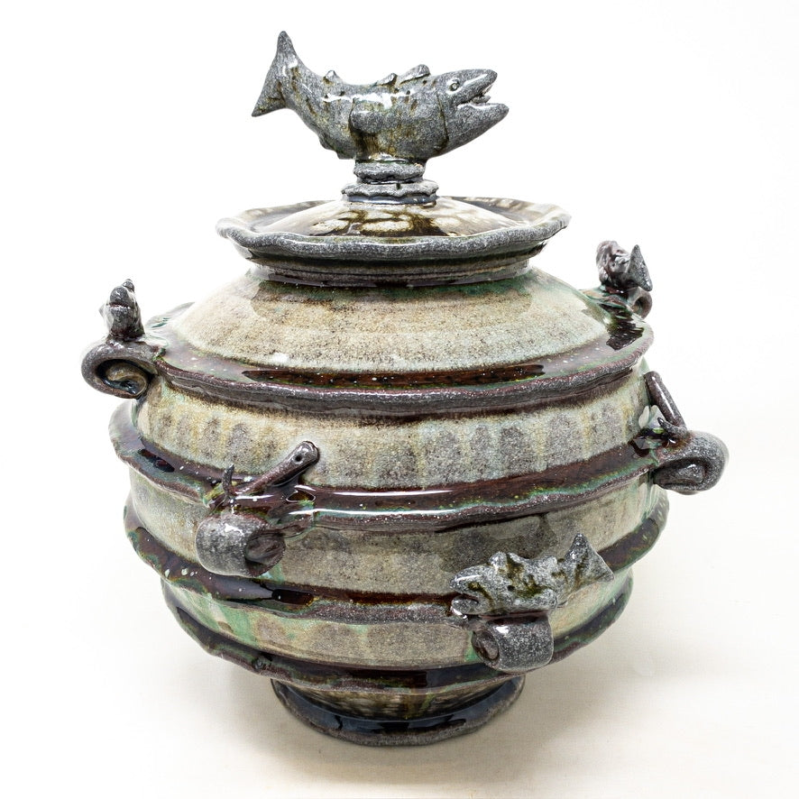 This stoneware jar is made with clay and soda fired.