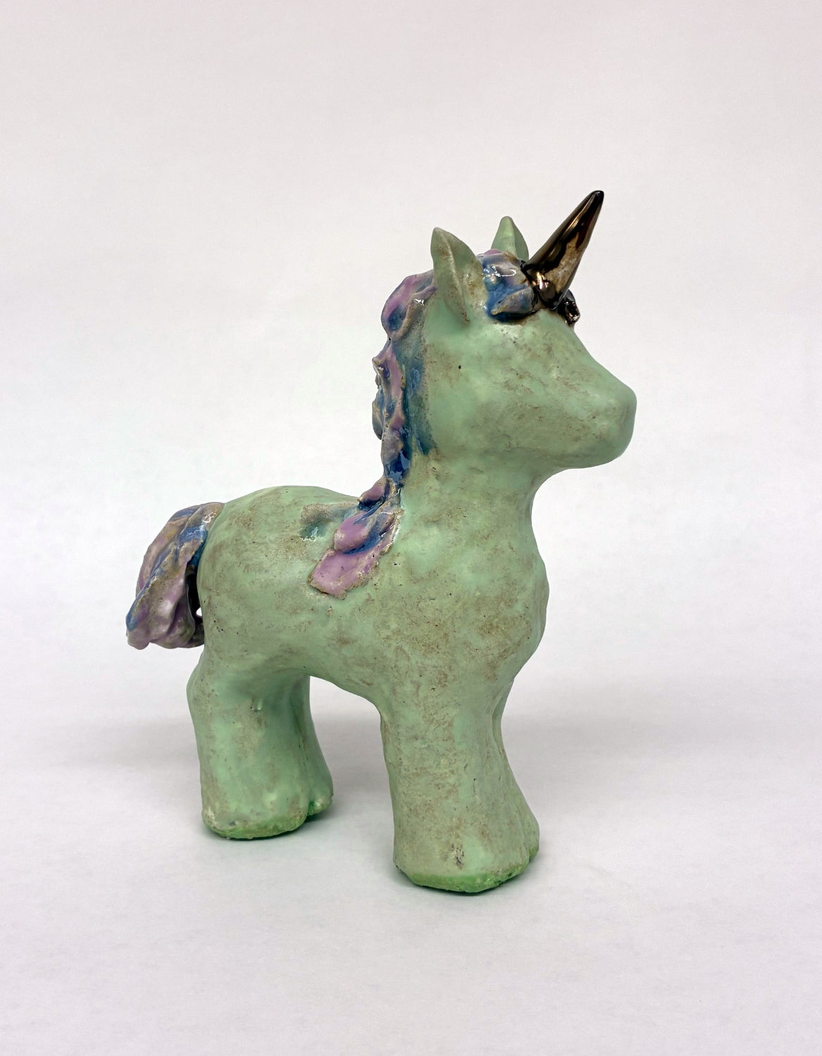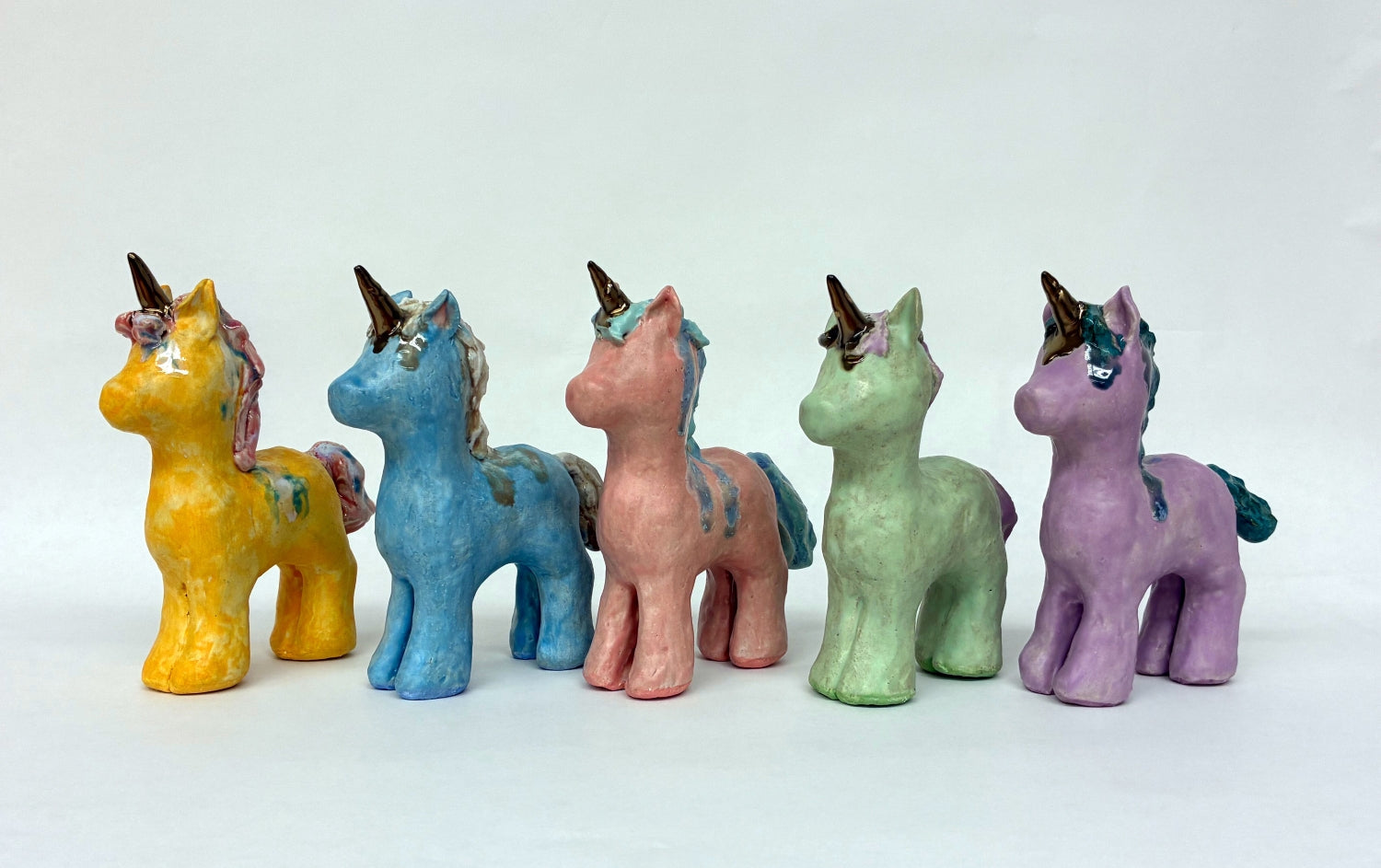 This piece is called My Little Pony-sancai-inspired unicorns, take your dreams with you! Collect them all! (cone 6 stoneware)