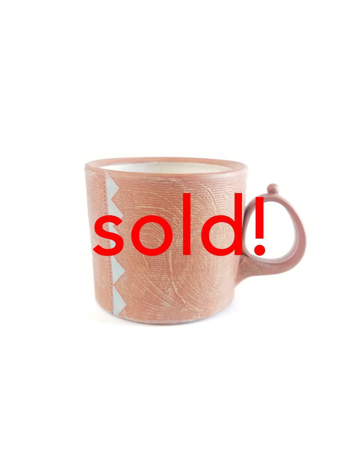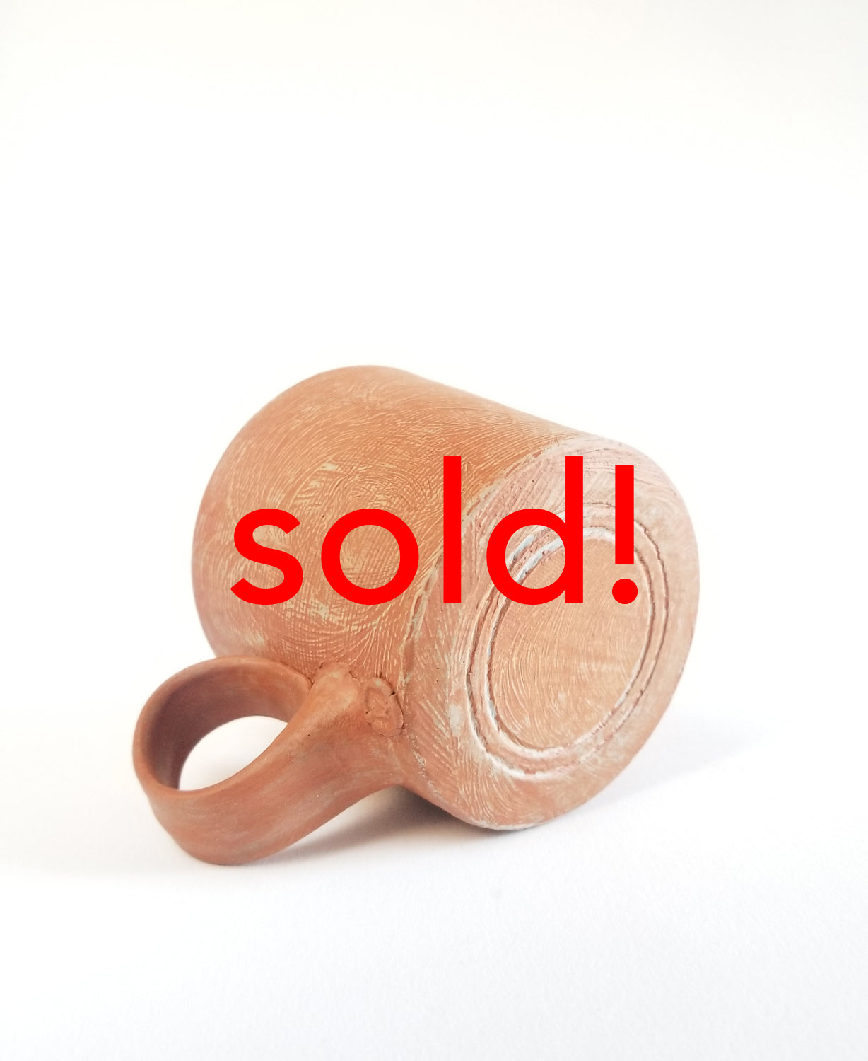 This piece is a mug made with cone 3 electric fired earthenware, slip and terra sigillata finish. Glossy off-white glaze inside. Holds approx. 8 oz.