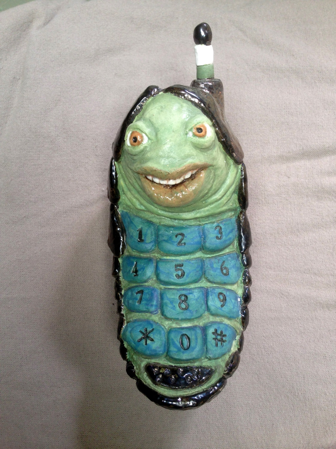 This piece is a bug flip phone wall sculpture