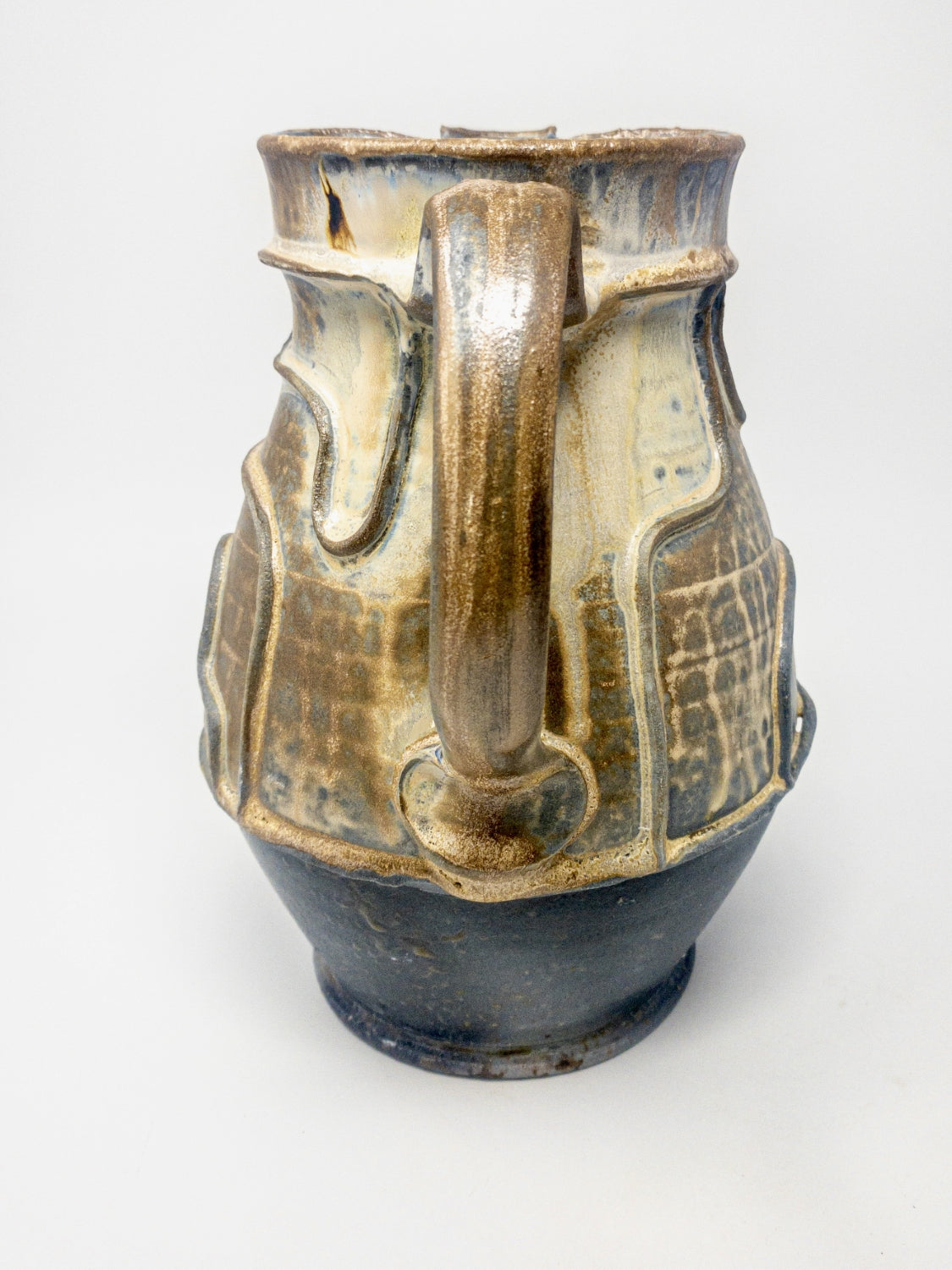 This pitcher is decorated with thin coils and fired in a wood burning kiln. It was inspired by medieval English forms and the tendency of early potters to decorate with coils in many cultures.