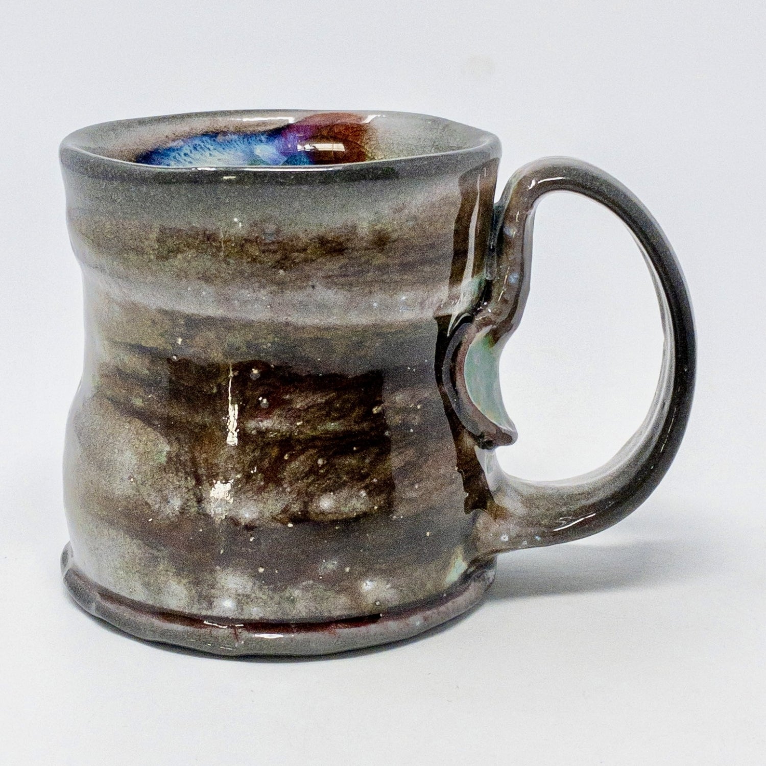 This mug was fired on its side resting on three seashells that formed a tripod. By firing the piece on its side Jon allows ash and fluxes to accumulate on the top of the piece throughout the firing of the soda kiln, and gravity to allow the glaze to move and respond to the form resulting in natural drips.