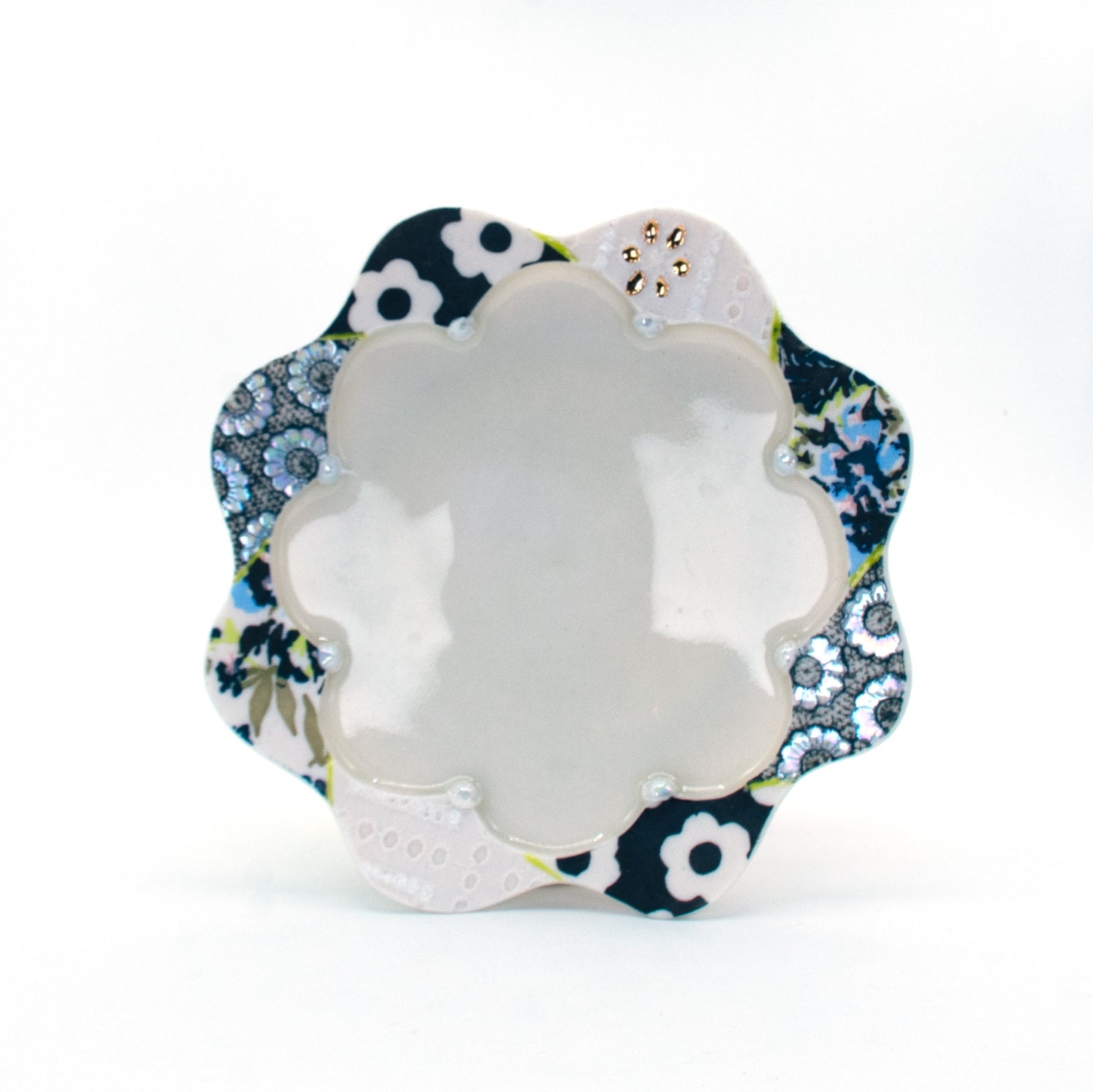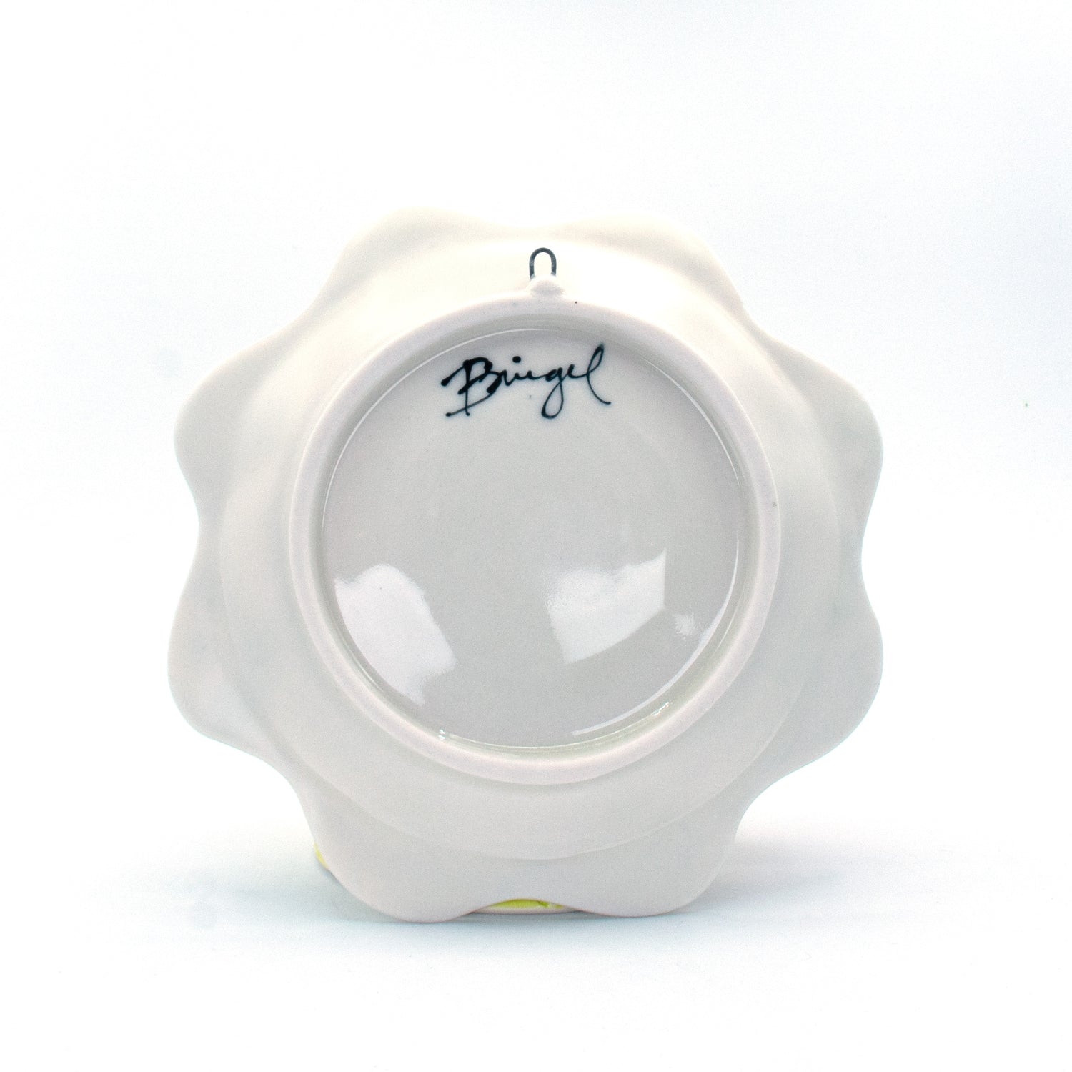 This piece is made cone 6 translucent porcelain, underglaze, gloss liner glaze, satin glaze, gold and mother of pearl luster, nichrome wire hanging hook.
