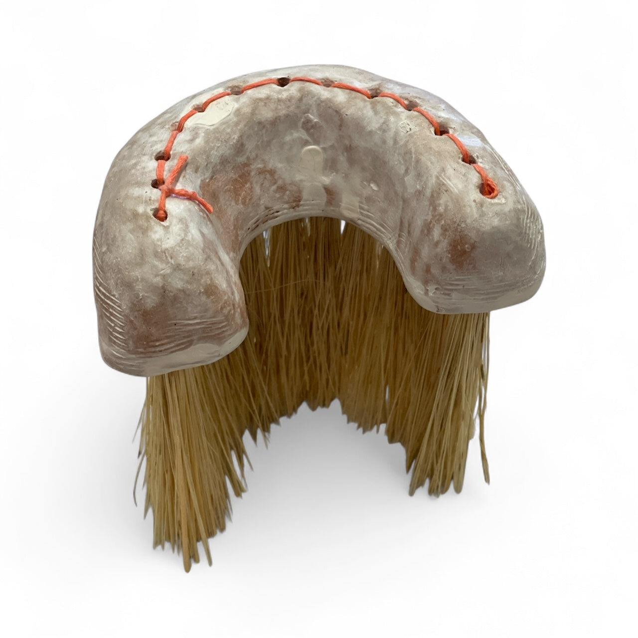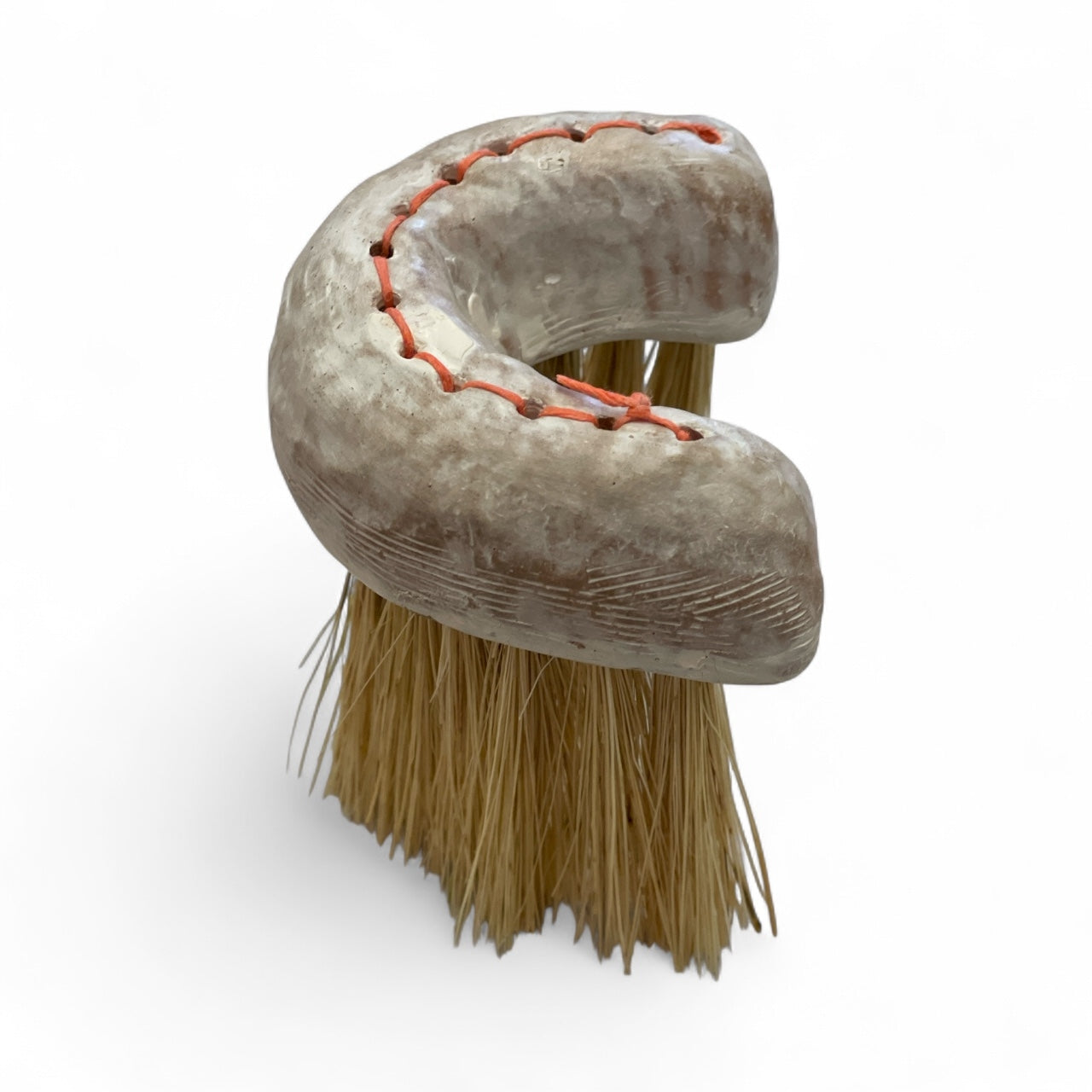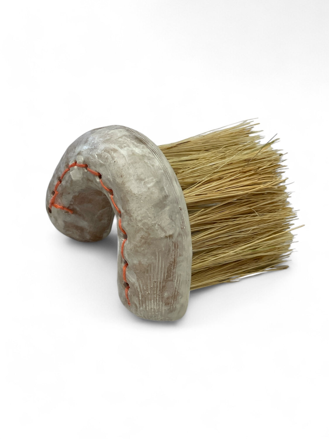 This piece is a hand brush made of stoneware, Tampico, and waxed linen.